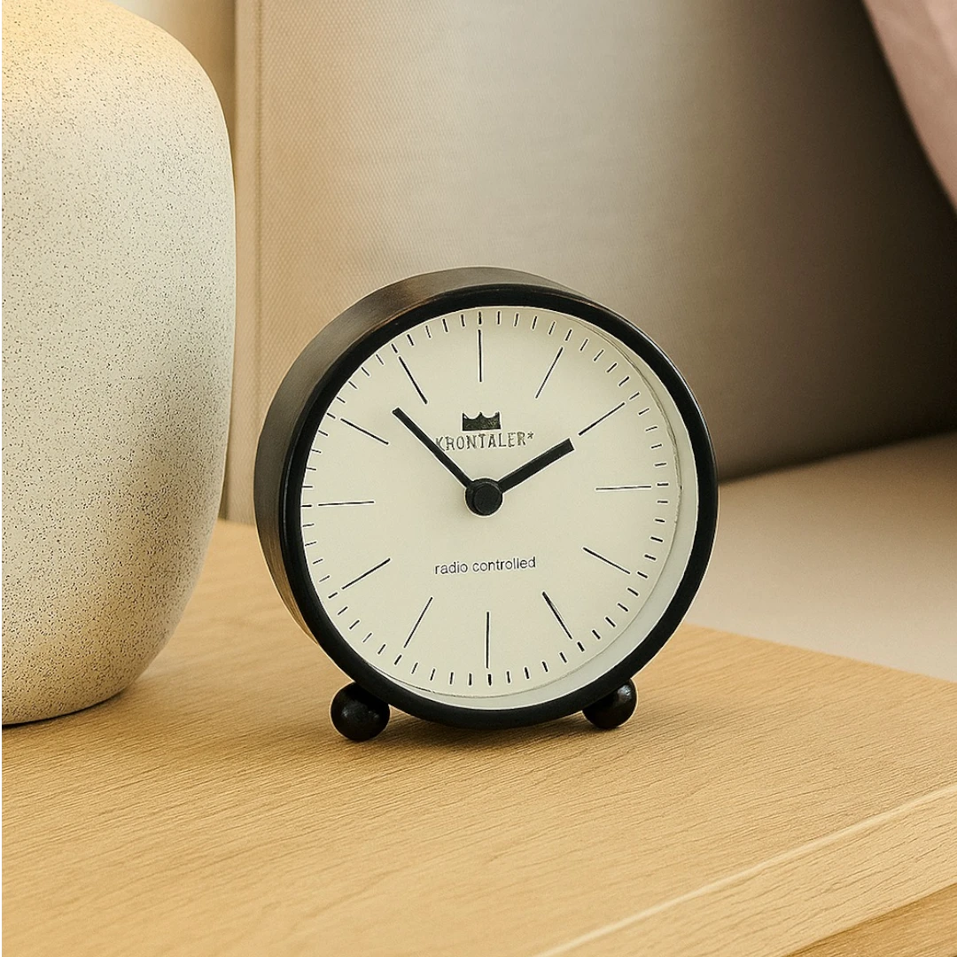 The KRONTALER radio-controlled table clock combines modern minimalism with precision timekeeping. Featuring a clean white face, bold black hands, and a sleek black frame with round feet, it offers a timeless look for desks, nightstands, or shelves. Automatically synchronized via radio signal, it ensures accurate time without manual adjustments. A quiet, non-ticking mechanism makes it ideal for bedrooms or workspaces.