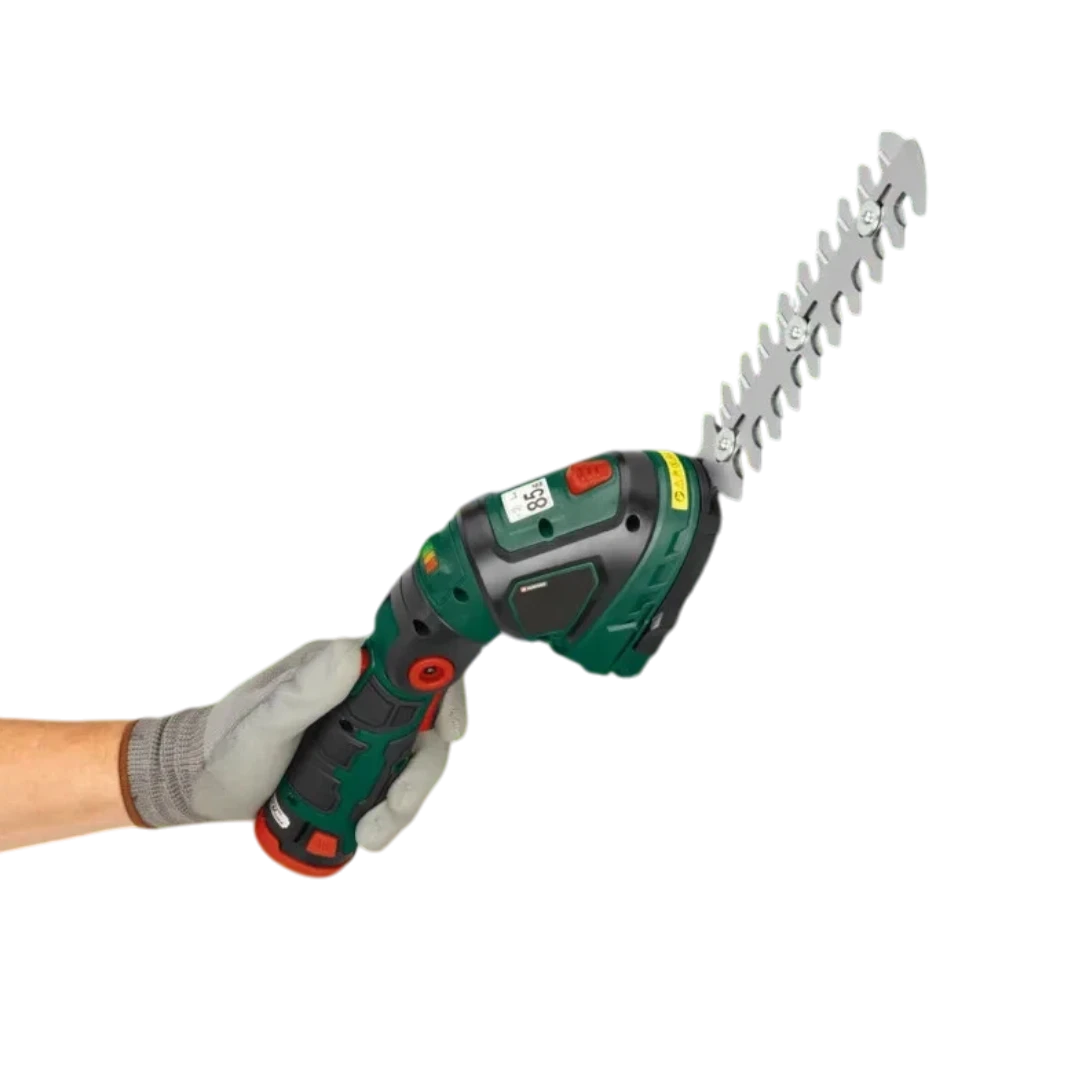 مقص باركسايد اللاسلكي هو أداة حديقة متعددة الوظائف تعمل كمقص للعشب ومقص للشجيرات. يتميز بنظام تبديل شفرات دون أدوات، ومقبض ناعم قابل للدوران بزاوية ١٨٠ درجة، ومقبض طويل قابل للتمديد مع عجلات لتوفير راحة إضافية أثناء الاستخدام. يوفر عرض قص يبلغ ١٢ سم للعشب وشفرة بطول ١٧ سم للشجيرات يمكنها قص فروع بسماكة تصل إلى ٧٫٩ ملم، ما يجعله مثالياً لتشذيب أطراف الحدائق، أحواض الزهور والشجيرات الزخرفية. الجهاز متوافق مع بطاريات باركسايد X 12V ويحتوي على مؤشر بطارية بثلاث مستويات. يأتي المنتج كوحدة فقط دون بطارية أو شاحن، ويتضمن مقبضاً طويلاً مع عجلات وأغطية للشفرات للتخزين الآمن. البطاريات الموصى بها هي ١٢ فولت ٢ أمبير أو ٤ أمبير