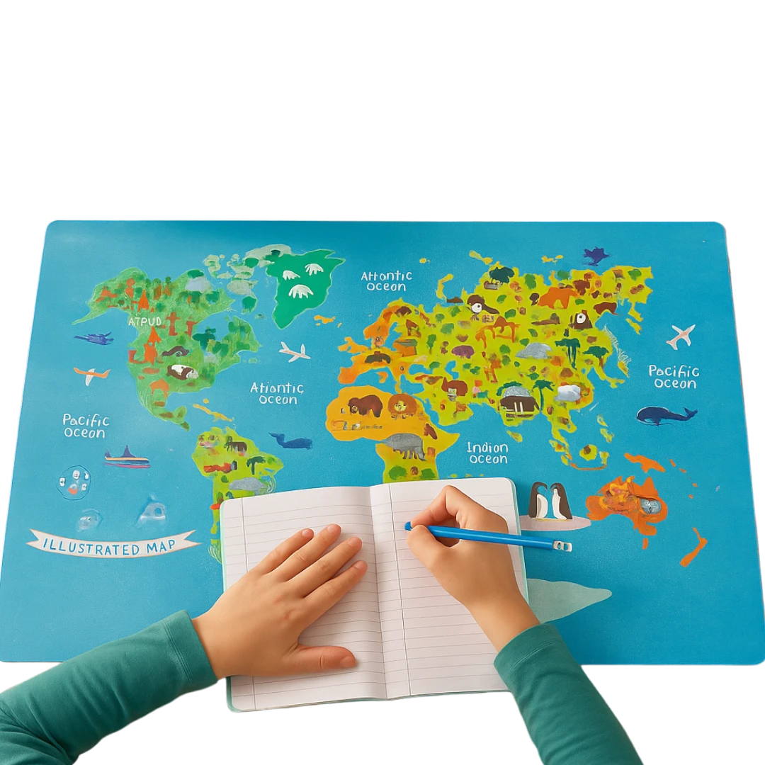 World Map Design – Perfect for young explorers, this colorful map features continents, oceans, and illustrated animals from around the globe. Great for learning geography while protecting your desk.